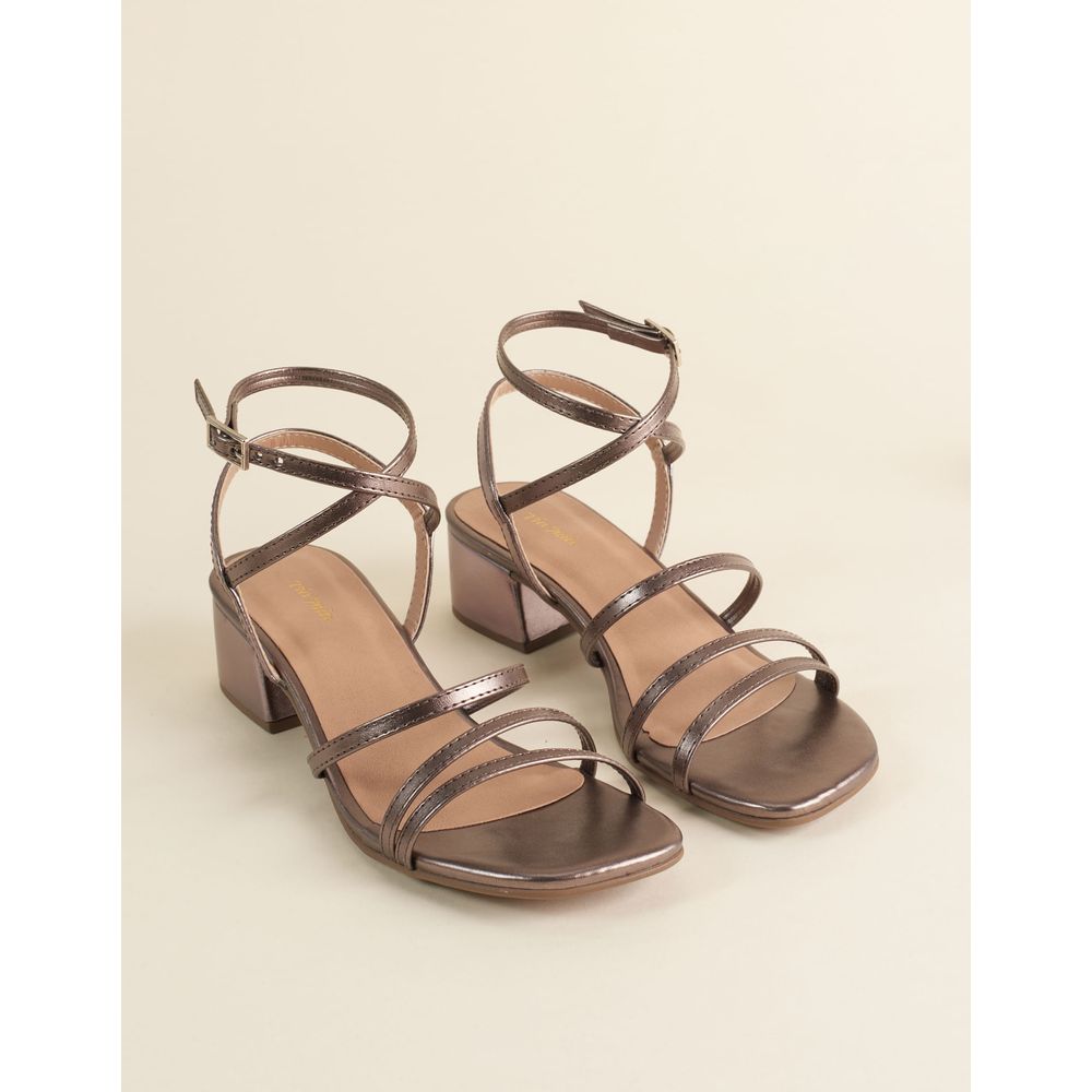 Sandália média com cabedal em tiras de material soft metalizado. Palmilha e salto forrados no mesmo tom. Um clássico repaginado com acabamento brilhante. Medida do salto: 4cm