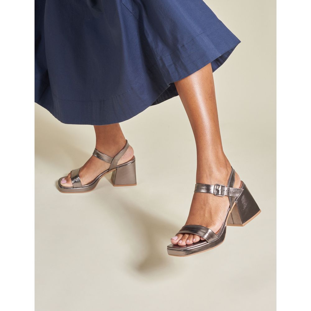 Sandália meia pata em material soft metalizado. Fechamento por fivela, com salto e palmilha revestidos no mesmo material. Brilhante e imponente, é a pedida perfeita para destacar qualquer produção. Medidas: salto 8cm | meia pata 2cm.