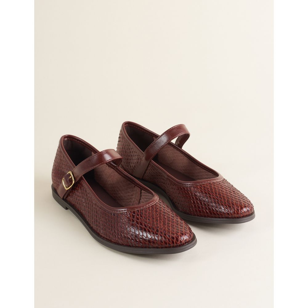 Sapatilha em couro escamado, com palmilha no mesmo tom para um visual uniforme. Possui tira de fechamento com fivela dourada, que adiciona um toque delicado e sofisticado ao modelo.