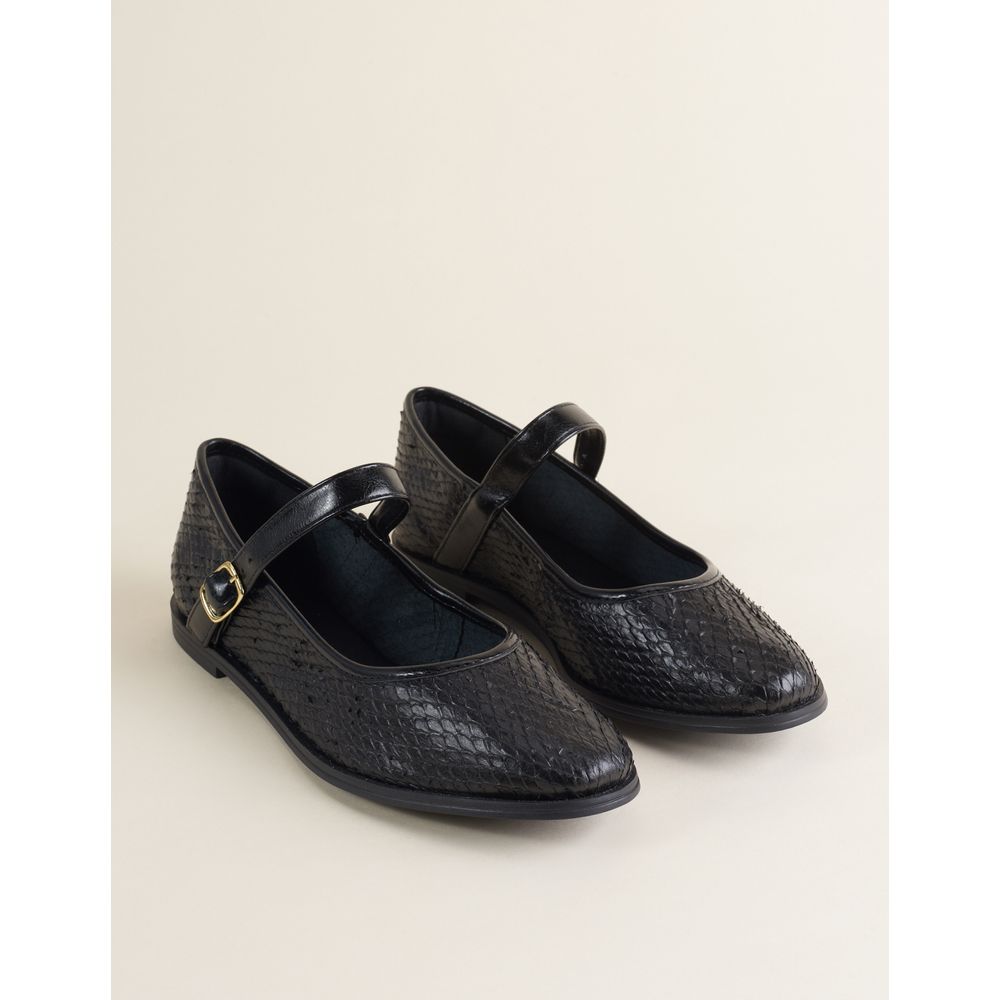 Sapatilha em couro escamado, com palmilha no mesmo tom para um visual uniforme. Possui tira de fechamento com fivela dourada, que adiciona um toque delicado e sofisticado ao modelo.
