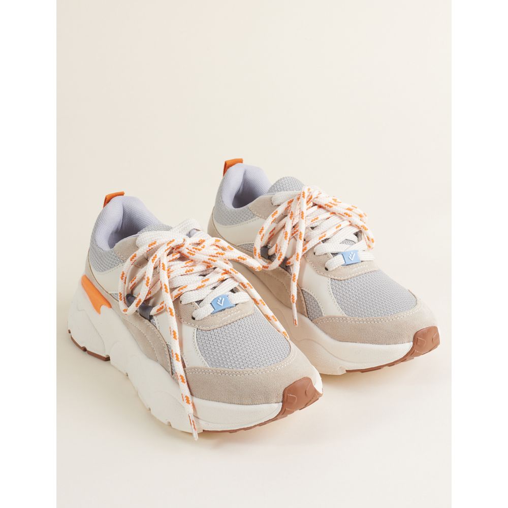 Tênis com recortes e solado esportivo em mix de materiais como tecido texturizado, criando um visual dinâmico e atual. Possui duas opções de cadarço: um liso e outro bicolor, para variar o styling. O acabamento interno com espuma no traseiro e na lingueta garante mais conforto no uso. O solado robusto com detalhes contrastantes reforça a proposta, enquanto a assinatura Via Mia aparece em plaquinha emborrachada. Altura do solado: 4,5 cm.
